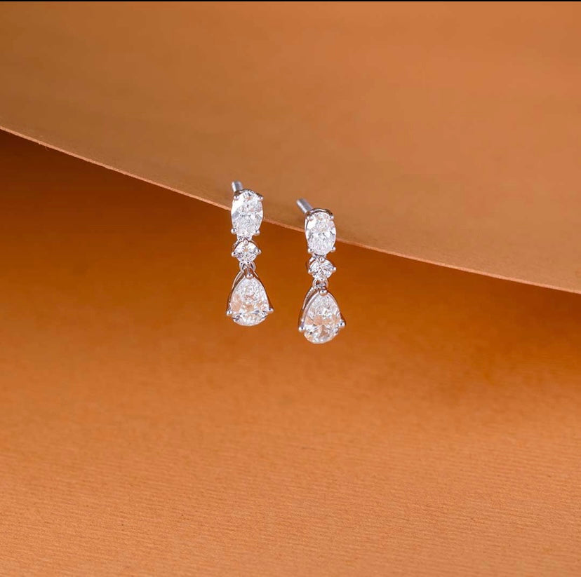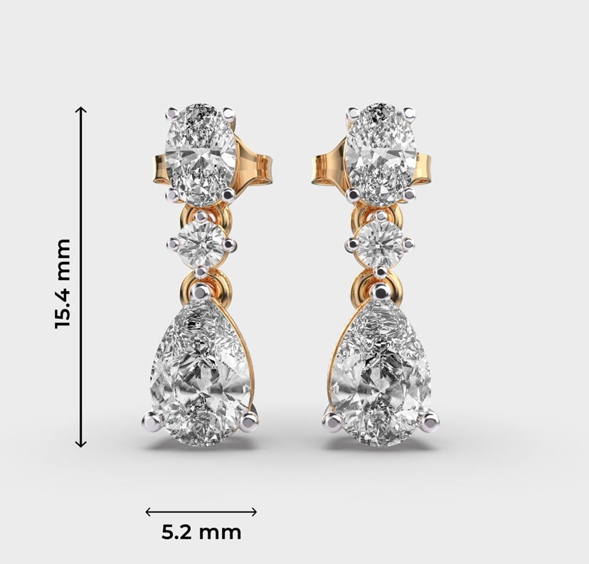 Gold-based dangler earrings featuring stacked round diamonds with a large pear-cut diamond drop. A luxurious and radiant design.