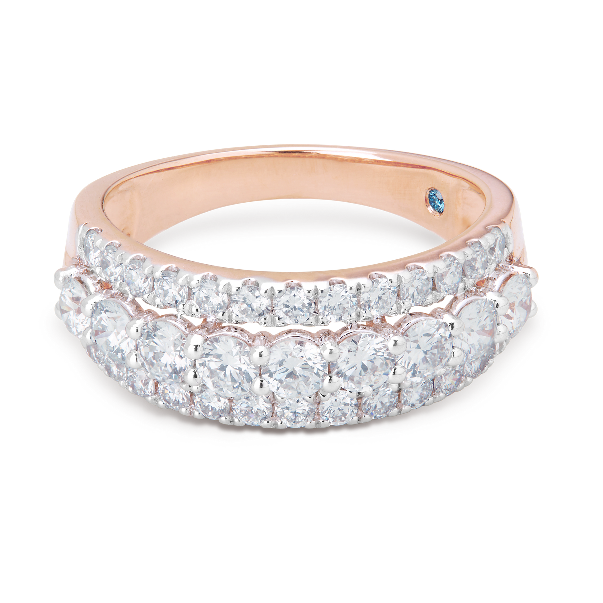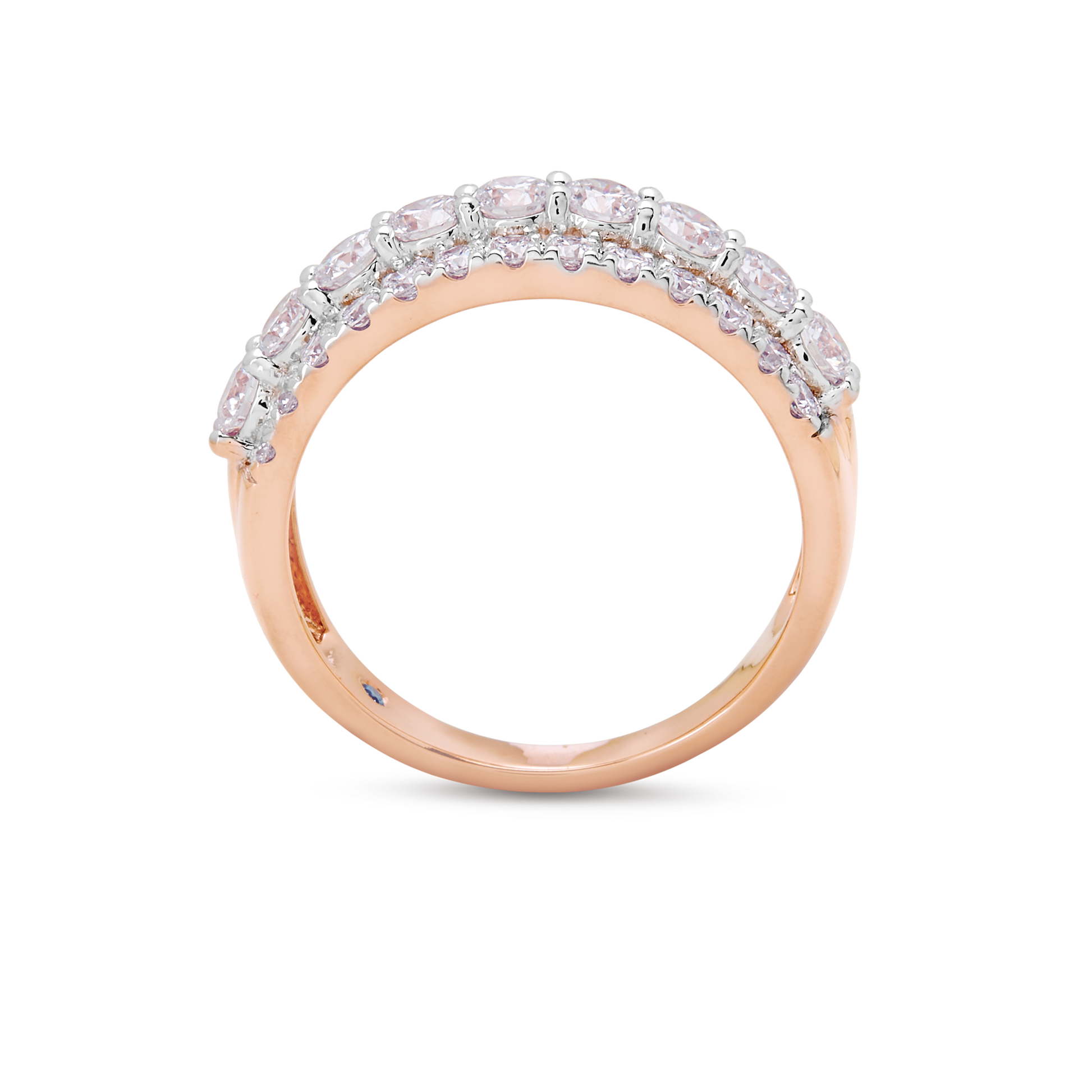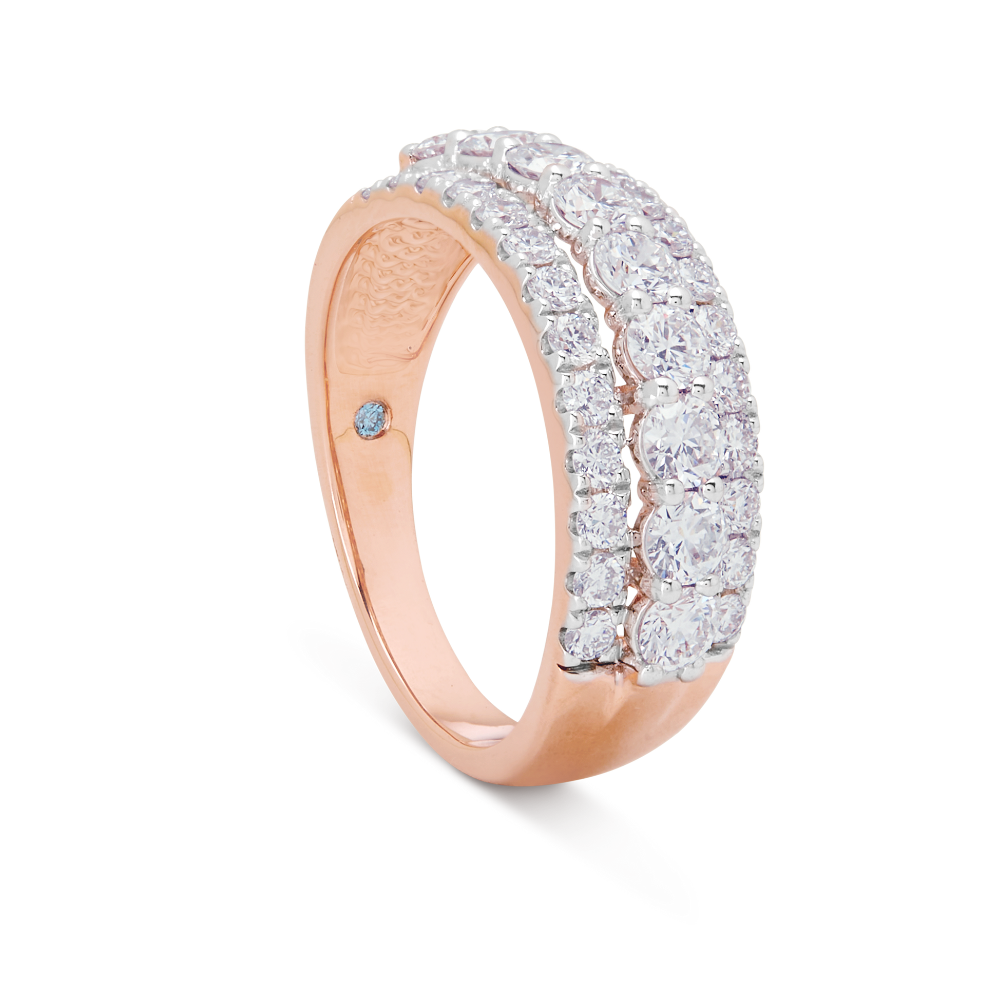 Three rows of diamonds set in rose gold—pavé flanks a center band of brilliant rounds for layered, radiant allure.