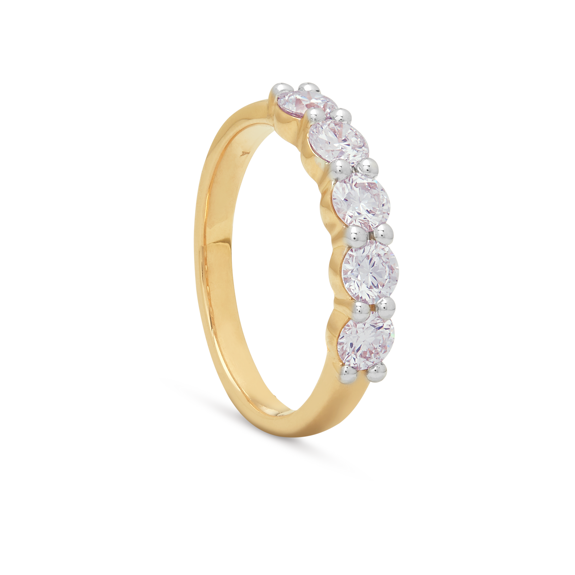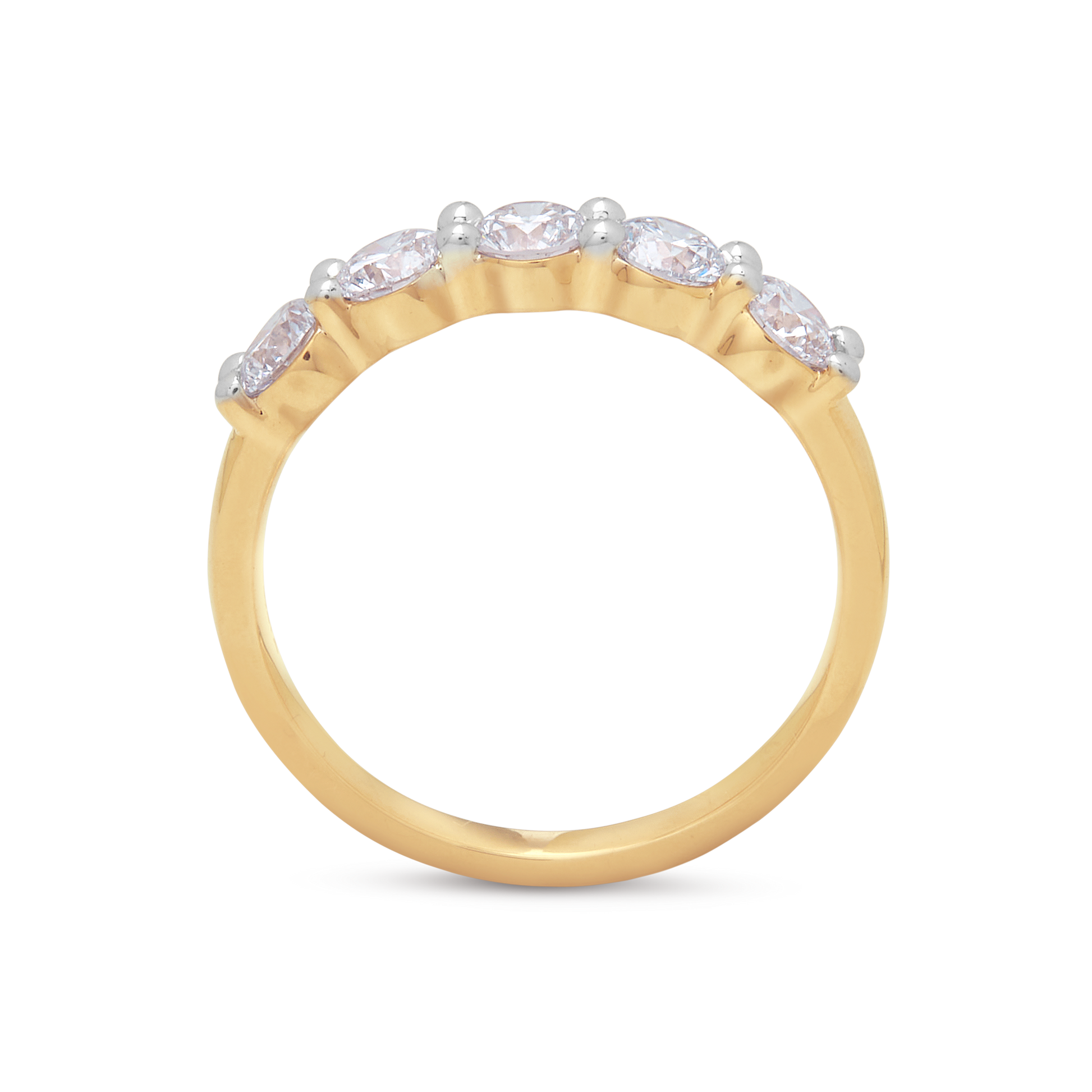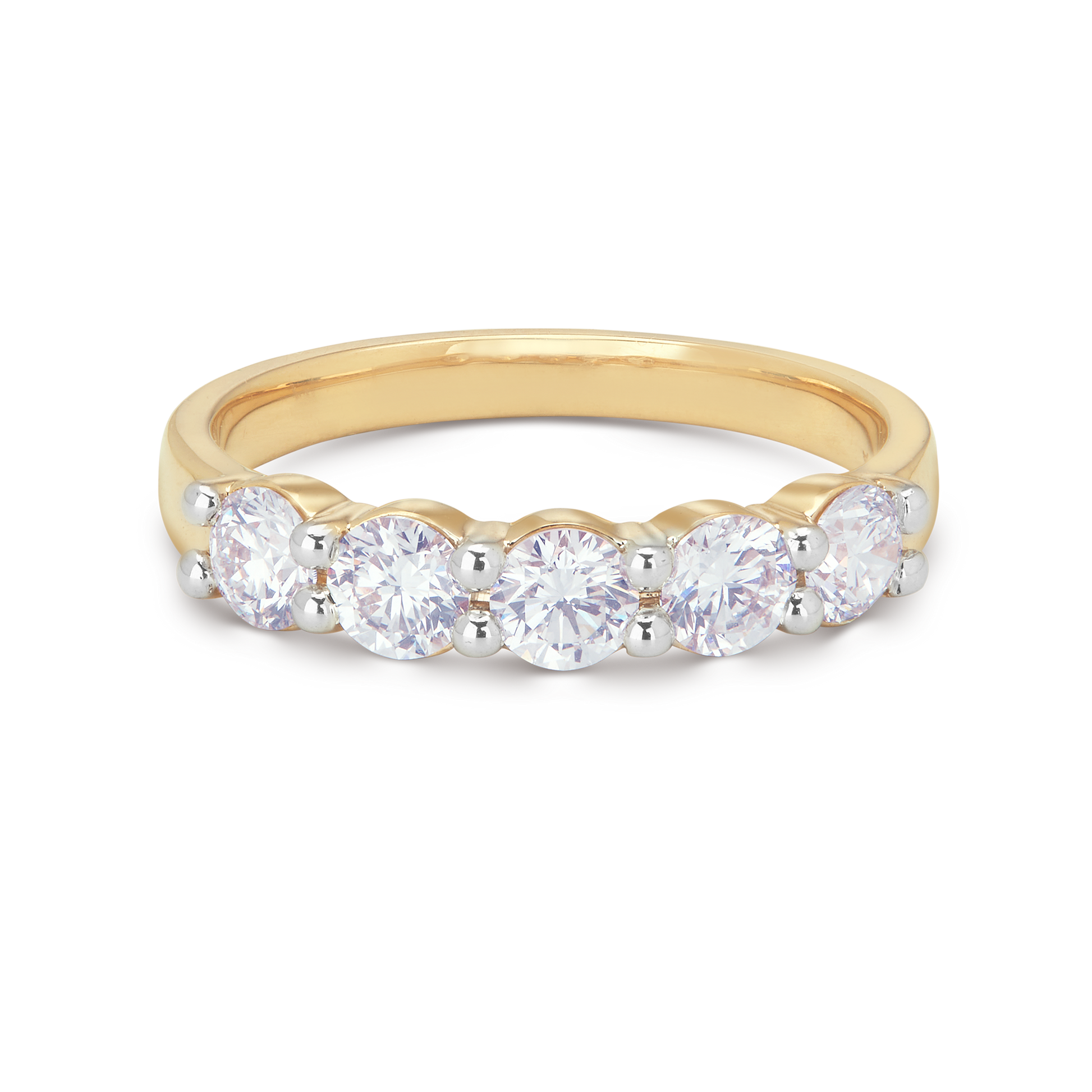 Five round diamonds set in white-gold prongs across a yellow-gold band—classic symmetry meets luminous flair.